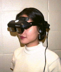 Somewhat like virtual reality, augmented reality uses a headset to give visual and auditory information to the user. The headset, which looks like a large version of those used in 3D movie theaters, is connected to a computer that feeds information into the eyeglasses and the headphones. [See Figure 1]