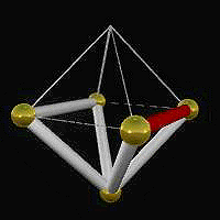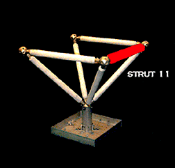 In order to provide the computer with information about the spaceframe itself, mock-ups of the construction sequence were programmed in advance. A computer mock-up serves to locate the spaceframe and the next piece to be assembled in 3D space. In Figure 6, strut eleven appears in red, indicating its position in virtual space though it has not yet been added to the spaceframe.