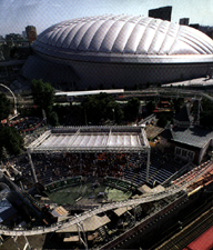 Deflations, while bad, aren't usually all that bad because the roof will hang up over the spectator area even when bellied down. But when the Silverdome in Pontiac, Michigan, deflated under heavy snow in March 1985, the fabric tore on some lighting framework and high winds whipped it like a sheet on a clothesline. A weather radar system now watches over the new roof, whlch cost $10 miIlion. At the Metrodome in Minneapolis, a 1986 incident led to a partial evacuation during a Twins game attended by 32,000 people. When wind shear hit one side of the roof, the control system registered it as a surge in the building's air pressure and, instead of tautening the roof against the wind, automatically began dumping air to compensate. The 10,000-pound light banks and the ceiling-hung speakers started to sway, and plugs in the roof popped, pouring water down the third-base line. Spectators on the upper decks had to evacuate, using revolving doors to avoid further loss of pressure. Some people panicked and there were minor injuries. After nine minutes, the roof stabilized and the game resumed. But such incidents are one reason why engineers have developed new ways to put up domes.