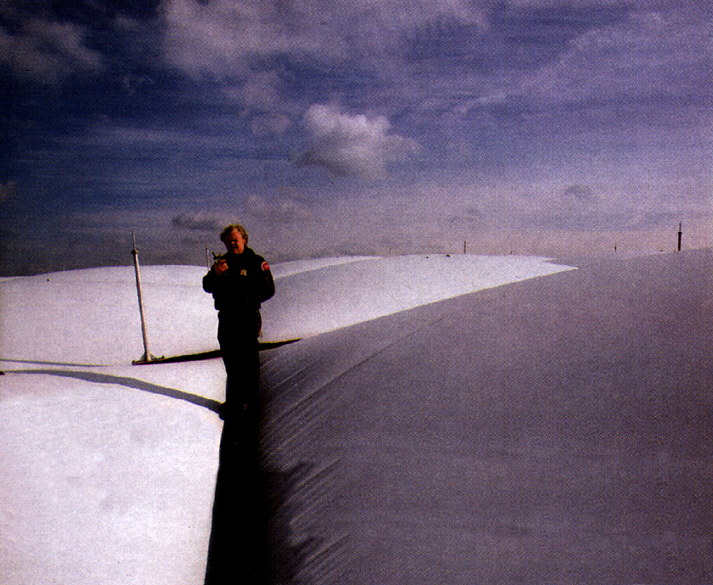 The space is so vast that it's possible to forget you are indoors, much less tilting and whirling headon into an architectural support column-a continuous column of air maintained at a pressure slightly higher than the pressure outside. You tend to notice only at the emergency doors or at the hatchway onto the roof, where the air pressure suddenly turns into a 35-mile-an-hour wind at your back.