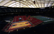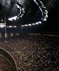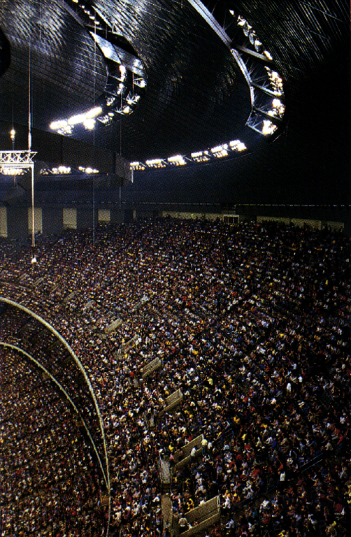 The Hoosier Dome in downtown Indianapolis is one of eight air-supported domes in this country that Geiger went on to engineer after the triumph at Osaka. Visiting it, you get a sense of both the magical simplicity and the underlying complexity of the design. On this particular evening, the dome floor has become a fairground with amusement park rides for families attending a national convention of county officials. Politicians with their feet up ride three abreast down a long slide, while their children turn shades of pale on the Tilt-A-Whirl.