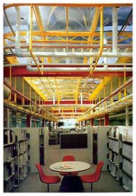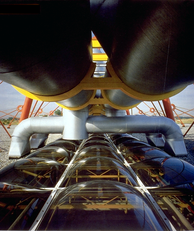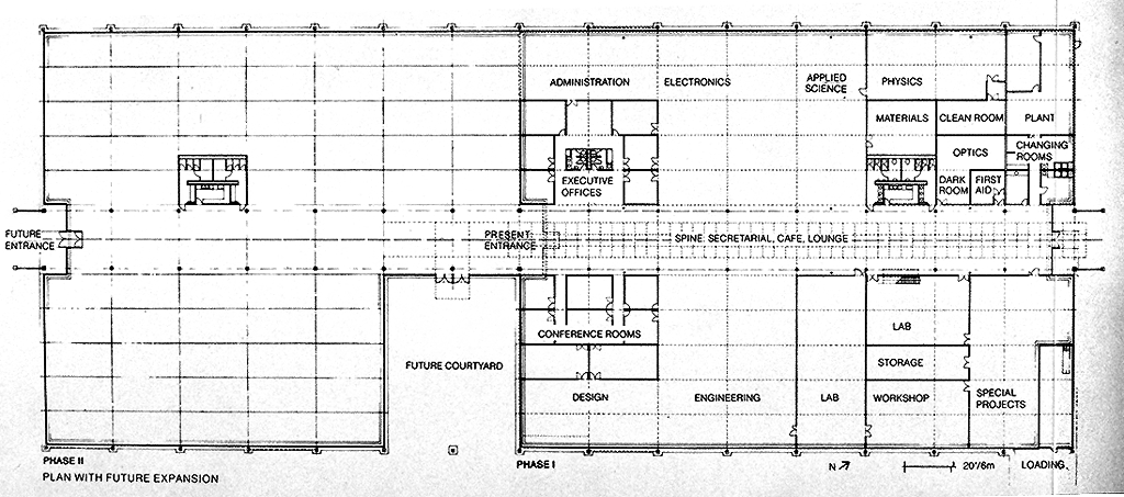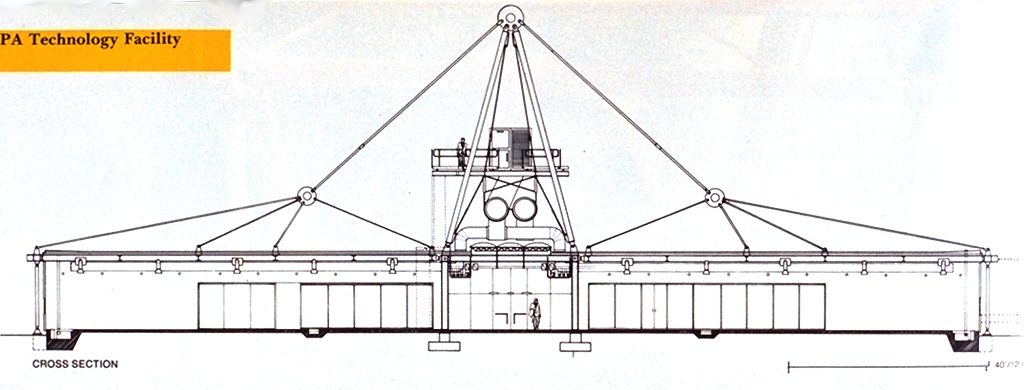 PA's closest antecedent, both chronologically and typologically, is the Inmos factory in South Wales. The use of a lightweight roof structure suspended from a central mast to permit maximum column-free space; the concentration of mechanical services in a cradle suspended from the mast to permit relatively easy access for repairs and replacement; the creation of a social "condenser" where employees can interact while en route to the labs-all are ideas carried over from the Inmos building.