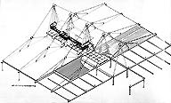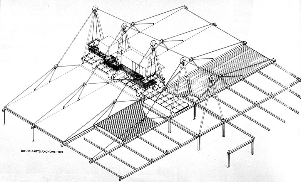 Project: PA Technology Laboratory and Corporate Facility, Hightstown, near Princeton, N.J. Architect: Richard Rogers & Partners Ltd., London (Ram Ahronov, Gennaro Picardi, John McAslan); Kelbaugh & Lee, Princeton, N.J. (Sang Lee, with Doug Kelbaugh, Ron Ellis, William Noval, and Vichi Myers); Pierre Botschi, consultant architect. Client: PA Technology (Max McGregor). Site: 12.5 acres of flat land approximately 8 miles east of Princeton, the first parcel of a larger office/research delvelopment. Program: office space and common facilities; laboratories; conference rooms, totaling 42,600 sq ft. Structural system: nine 60-ft-high tubular steel masts, from which are suspended 80-ft-long steel beams to either side; stainless steel pin connections. Major materials: tubular steel;translucent fiberglass sandwich panels; demountable partitions; open office furniture (see Building Materials, p. 138). Mechanical system: gas-fired steam boiler; roof-top unit air conditioner and gas heater; exposed and color-coded HVAC, plumbing, and electrical-elements. Consultants: Zion and Breen, landscape; Ove Arup & Partners, U.K., and Robert Silman Associates, U.S.A., structural; Ove Arup & Partners, U.K., and Syska & Hennessy, U.S.A., mechanical. General Contractor: John W. Ryan Construction Co. Costs: $4,704,000 completed ($110 per sq ft). Drawings: Richard Rogers & Partners. Photos: Otto Baitz.