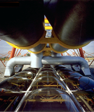 The kit of partsThe basic premise for PA Technology-to maximize column-free space-is accomplished by means of a tubular steel tension structure. As explained by engineer Peter Rice of Ove Arup & Partners, the structural system (see axonometric, facing page) has at its base a portal frame that supports in piggyback fashion an A-frame, from which are suspended standard section steel beams spanning 75 feet to either side of the central spine. Tie-down columns at the outer ends of these beams act in both tension and compression. Platforms suspended between the A-frames, which are set 30 feet on center, support al1 exposed mechanical equipment and provide longitudinal bracing. The structure has been pared down to a bare minimum; only the cross-bracing between A-frames seems slightly fussy.Virtually all elements are off-the-shelf, the primary exception being the pin-ended columns. Field welding was kept to a minimum, and pin connections were used wherever possible. Given their reputation as "high profile" (read expensive) architects, Rogers and his associates are understandably anxious to emphasize this aspect of PA Technology as proof that high tech can be competitive even by American standards. A second low-cost industrial project at Maidenhead, completed at approximately the same time as PA Technology, is also considered crucial to the firm's portfolio. The shift from one-off to off the shelf may, however, exact a price. The heavy reliance on standard elements produces some inelegant connections, as, for example, where tieiown column, outrigger beam, and suspenion rod converge. Still, the overall silhouette of PA Technology is simple and powerful.