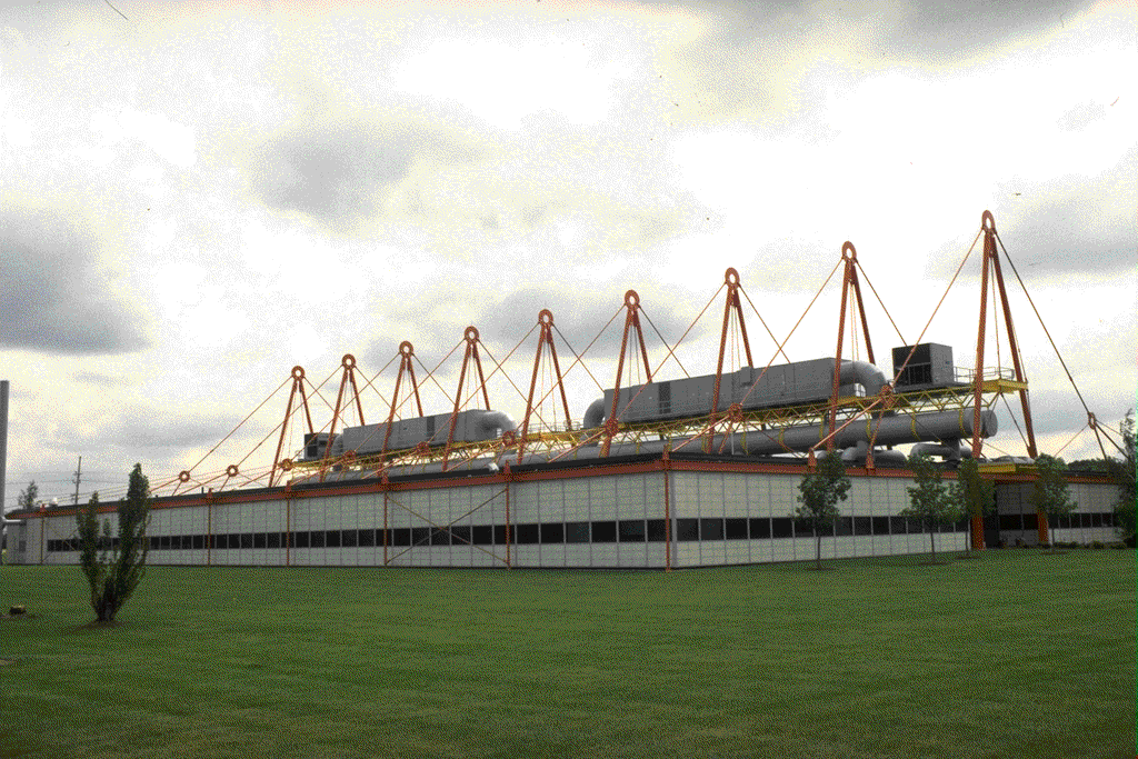 The stayed roof provides a largely column-free interior, which increases flexibility and, with the exposed HVAC equipment and translucent facade panels, provides the building's "high tech" expression. The building's articulated structural components reflect their design as a "kit of parts," premanufactured from off the shelf products. Aside from being a celebration of mechanical equipment, the HVAC system is situated outside for pragmatic reasons. Rogers points out that mechanical conditioning equipment generally needs to be replaced long before the building shell it services. So to simplify refurbishing at the PATCenter, the bulk of the HVAC system is set on bridges between the A-frame masts above the roof.