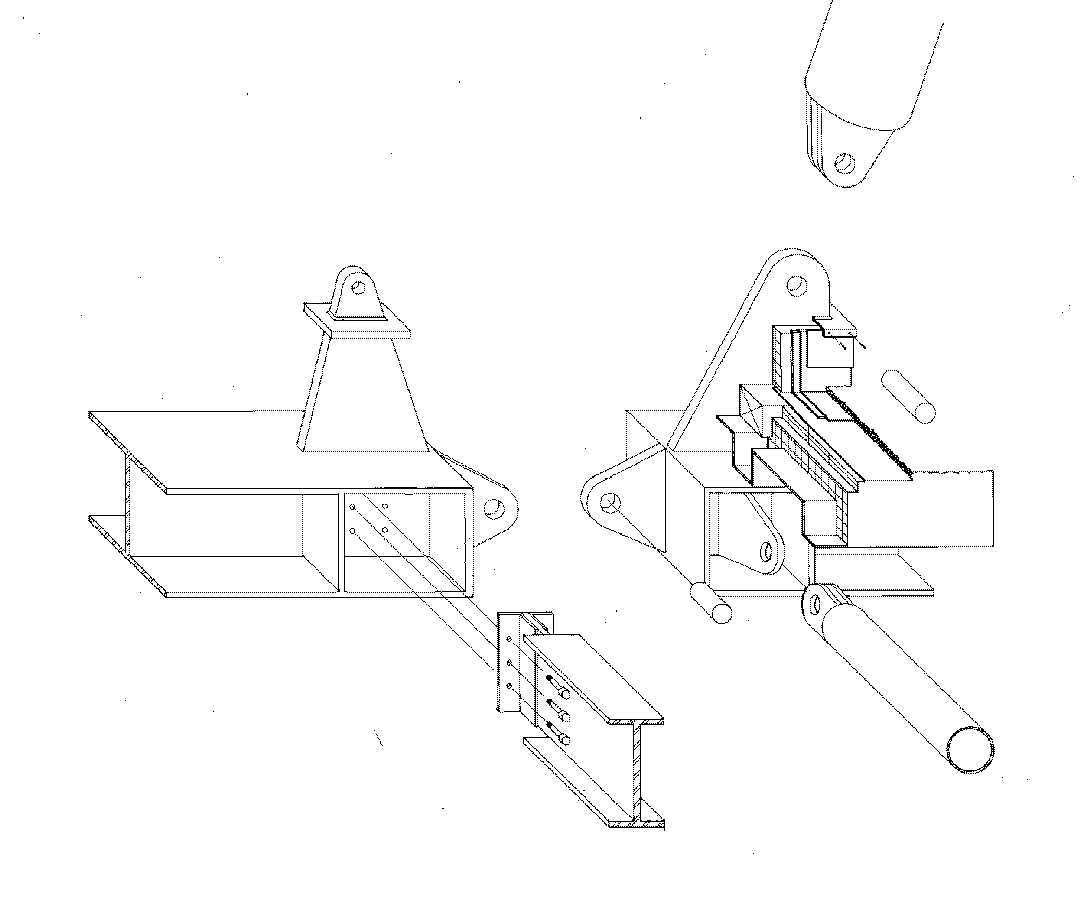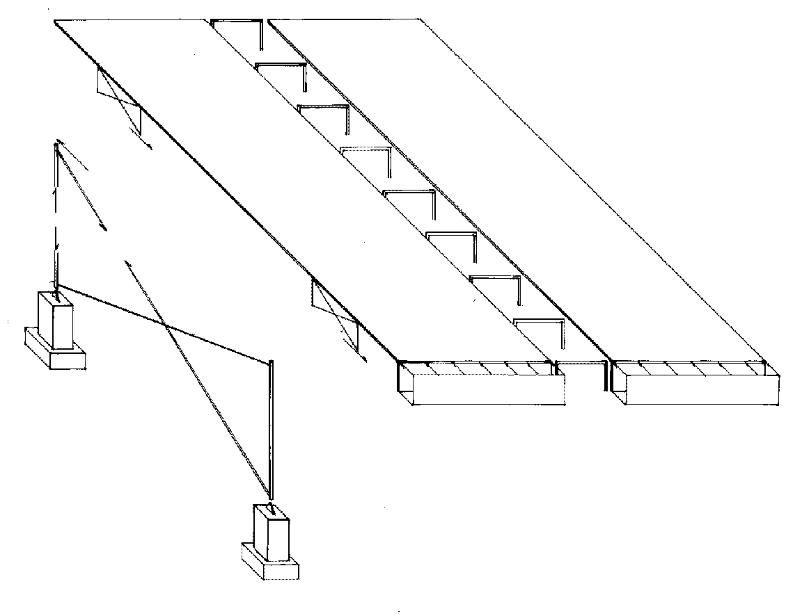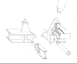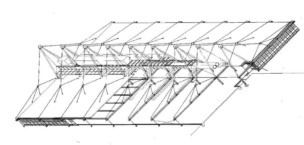 Concrete floor slab aside, the PATCenter's structure provides an armature from which the rest of the building's enclosure and servicing are hung. Set on thirty foot centers, its A-frame masts rise forty five feet above twenty foot wide portal frames that define the building's central circulation spine; tension rods pinned to the tops of the frames branch out to pick up 75 foot long roof beams at four points. Tension struts at the ends of these beams stabilize the lightweight roof against uplift loads. Secondary beams supporting the five inch deep roof deck span between the main roof beams on thirteen foot centers. The outermost fascing beam is exposed on the building facade. Except for the local bending of the beams, gravity loads subject the strucuure to essentially to only axial forces. Reflecting this, and expressing the kit-of-parts concept, most major structural connections are pinned through perforated gusset plates or clevises. With the addition of more A-frame masts and stays, the building is extensible on 30 foot modules.