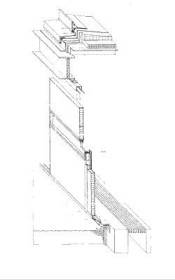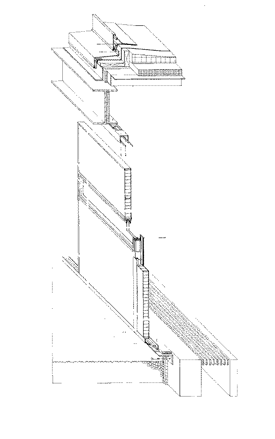 The facade is made of prefabricated preglazed, 2-3/4 inch thick "Kalwall" panels set in aluminum frames. Twenty percent of the total panel area is clear glazed. The remainder is made of a sandwich of translucent fiberglass insulation set between sheets of rigid fiberglass. The 17% transmittance of this assembly is a source of diffuse natural light during the day, and makes the building luminesce at night when lit from within. The Kalwall panels have an R value of 4.5 ft * F * hr / BTU.(2) Panels were prefabricated and pre-glazed to minimize the time and relative expense of on-site labor. They were mechanically fastened in place at the construction site to the roof fascia beams and foundation using continuous top channels and base angles. Aluminum, screwed in place mullions were then installed to seal the panels' vertical joints. Although the inside webs of the exposed steel fascia beams were halfheartedly insulated, their top and bottom flanges create a continuous thermal short circuit. This problem is worsened by the cooling fin effect created by their contact with the roof deck.