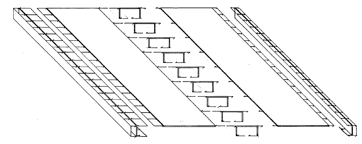 Horizontal wind load is distributed by the building's facade panels (acting as one-way slabs) to the roof and ground planes. Wind is resisted ar the upper level by the steel roof deck acting compositely with the beams beneath it as a diaphragm. Wind parallel to the A-frames is distributed by the diaphragms to the portal frames at the center of the building. In the perpendicular direction, the roof diaphragm distributes wind forces to four trusses at the edges of the building and two struts at the rear end of the circulation spine.