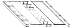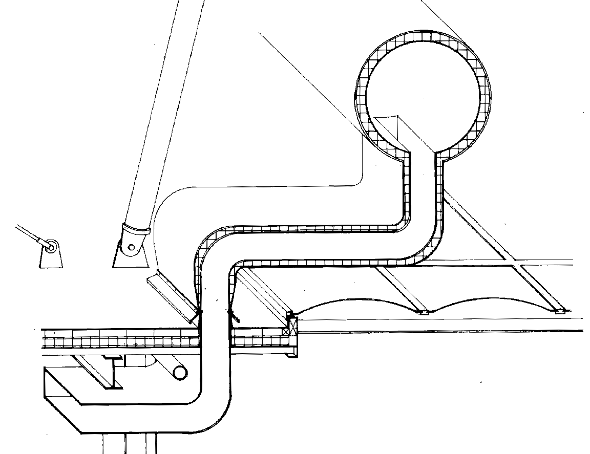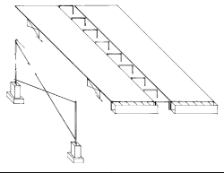 Besides a chiller, gas fired boiler and drain pipes, all the building's conditioning equipment and services are provided from above. Air handling units and primary supply and return ducts are cradled between the A-frame masts above the central spine's sky lights; hot and cold water is supplied just below roof level. To keep air moving to and from the air handling units at the proper temperature, the main ducts outside the building enclosure are insulated. Branch supply and return ducts penetrate the roof in each 30 foot bay between masts and serve the 75 foot wide building sections to either side of the central spine with variable air volume fan-assisted ducts.