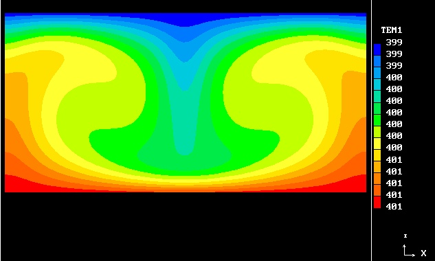 The first case involves a box that is .05m high (y-axis) and .1m wide(x-axis). The temperature of the bottom wall is 401K and the top wall is 399K. All other walls are assumed adiabatic. The small change in temperature assigned to the two walls are not expected to render significant property changes in air. Thus for this particular case, all air properties(density, laminar kinematic viscosity, specific heat, etc.) are assigned constant values.The relevant non-dimensional group for such a problem is the Rayleigh number. It is based on the height of the domain and the temperature difference between the upper and lower walls.