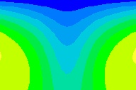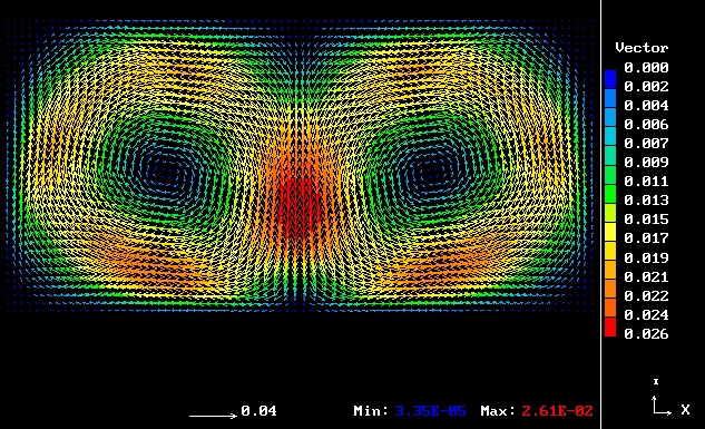 The steady flow consists of a symmetric pair of vortices that transfer heat from the lower wall to the upper wall. Air heated at the bottom wall rises along both the side walls, and loses heat to the top wall. This cool air then drops down in the center region.