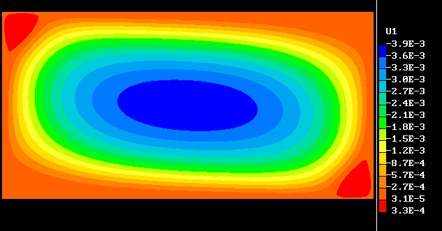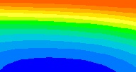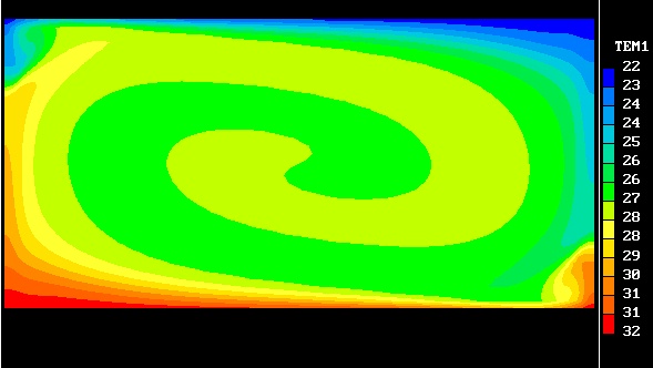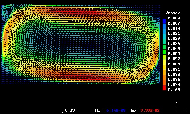 The most noted feature of this case is the formation of a single vortex of air flow within its domain. In the beginning of the run, two cells emerge and dominate the region, resembling the behavior of air flow in case1. However, small eddies soon appear in the lower corners similar those of case2. There after, these eddies grow and force the original two cells to decrease in size and in velocity so that the domain appears to be occupied by four vortices. The four vortices then break down to form one cell of air flow with a maximum velocity of 10cm/sec. As a result, all residual values fall as the solution converges quite nicely.