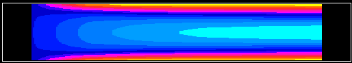 The geometry may be considered as two-dimensional; designating x as the horizontal, and y as the vertical, we neglect the z-axis, which comes out of the page and may be considered to be a plane of symmetry at the depth studied -- as if we considered only areas of the plates far from the edges which run parallel to the flow. We assume a uniform velocity field across the entrance, and give this value to Phoenics as an inlet boundary condition. The total problem specification includes:Gravity is neglected. This problem may be solved analytically through use of the continuity and Navier-Stokes equations. Assuming that velocity is a function of (x) alone, and assuming further that u is the only velocity component, we reach the following result: u(y) = (y*y - L*L) * 1/2 * 1/visc * dp/dx (where 2*L=plate separation, p=pressure) using u(y) = U = constant at inlet = average velocity everwhere (incompressible), we have: u,max = u(0) = -L*L/2 * 1/visc * dp/dx u,avg = -L*L/3 * 1/visc * dp/dx = 2/3 * u,max and, arranging everything in terms of U (which is given), we expect: dp/dx = -3*visc * 1/L*L * U and u(0) = 3/2 * U where u(0) is the velocity which develops on the centerline far downstream of the inlet plane. We need only select a Reynold's number suitable for laminar flow, use it to determine appropriate U and L, and give these numbers, along with the geometry, to Phoenics to see if the correct pressure gradient and centerline velocity are produced numerically. For the results which follow, I chose: U = .15 m/s , L = .005 m , visc = 1.8 E-5 (air) for a Reynold's number of Re = 2LU*dens./visc. = 100. With these inputs, analytical solutions are: dp/dx = .324 Pa/m u(0) = .225 m/s With a moderately dense grid (20 y-cells; 1 x-cell per cm), Phoenics found the following after approximately 15cm of plate length: dp/dx = .328 Pa/m u(0) = .224 m/s --> Both results are within 2% of their expected values. <--