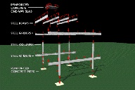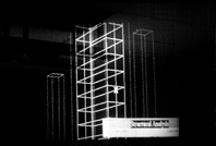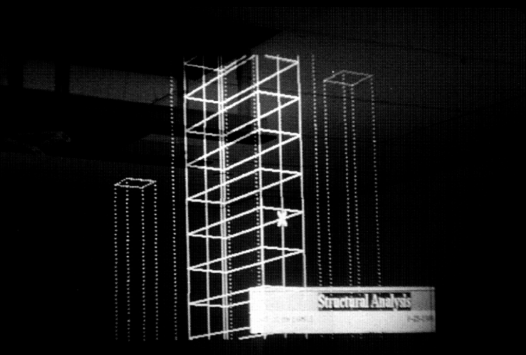 Our prototype allows the user to select a column in order to see it in more detail. We accomplish this by interpreting mouse pointer events on the X11 root window as affecting the 3D objects that project to the cursor position on the head-mounted display. In Figure 4, the user has selected the leftmost column, causing the outlines of the support structures to dim. (Our current display hardware is one-bit deep, so dimming is accomplished through the use of different line styles; in this case, dotted lines.) After a short delay, the reinforcing steel bar (re-bar) internal to the column is revealed, as shown in Figure 5. In addition, a structural analysis of the column is presented to the user. This information is provided by a world-fixed X11 window that allows the user to scroll through a textual analysis of the column produced by Dast, a commercially available structural analysis and design program (Das, 1993).