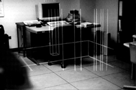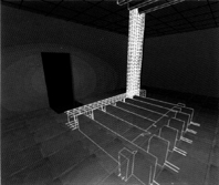 Our prototype application overlays a graphical representation of portions of a building's structural systems over a user's view of the room in which they are standing. We have built a partial model of Columbia's Schapiro Center for Physical Science and Engineering Research, which contains portions of the joists, beams, and columns that are in and near the lab in which our work is being performed. The model is based on the construction drawings provided by the building's architects. Figure 2 is a view of a corner of our lab photographed through our head-mounted display. The overlaid virtual world includes the outlines of parts of two support columns and the space between the structural concrete floor and the raised lab floor above it. The rightmost, larger column is inside the protrusion in the corner. (The representation of this column does not line up exactly with the visible walls because the physical column is not flush with the walls.) The other, smaller column is actually located in a nearby room. Figure 3 shows a view of the larger column with a different smaller, distant column, this time taken with the user looking up toward the ceiling of the room, such that part of the column extending into the next floor is visible.