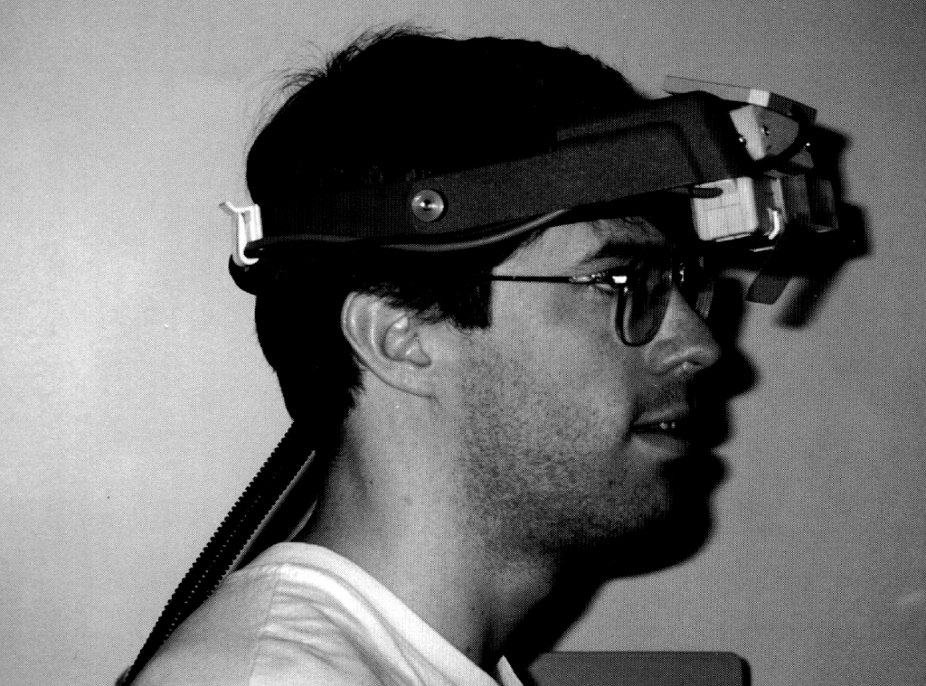 In our first project, we have applied our existing augmented reality testbed (Feiner, MacIntyre, & Seligmann, 1993) to expose a building's architectural anatomy, allowing the user to see its otherwise hidden structural systems. In the spirit of the first see-through head-mounted display developed by Sutherland (Sutherland, 1968), we and other researchers (e.g., (Robinett, 1992;Caudell- Mizell92)) use the term augmented reality to refer to systems that enrich the real world with a complementary virtual world. Our testbed supports a see-through head-mounted display that overlays a virtual world over the real world, using a mirror beam splitter to merge synthesized graphics with the user's view of the world. Figure 1 shows our current head-mounted display, which uses a Reflection Technology Private Eye display and Logitech ultrasonic tracker. Its graphics are rendered at 720*280 resolution and, in the application described here, include 3D vectors without hidden-line removal.