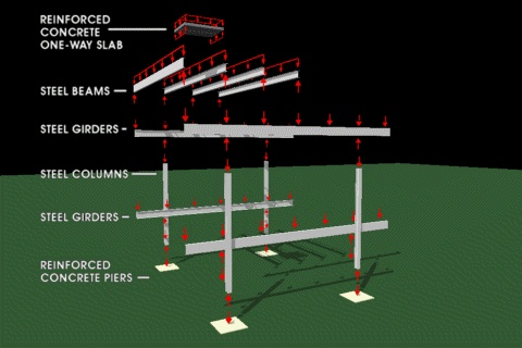 All structural components and finish materials (e.g., painted gypsum board and hung ceiling) are modeled as 3D objects, which allows us to vary their opacity independently. By simply manipulating the opacity of various materials, the user can opt to view any combination of re-bar, concrete, and finish surfaces. In this animated prototype, we have used this technique to determine what components to include as well as how much detail of a particular component to show as a function of the user's proximity to it. For example, we have found that showing all the re-bar inside a column is visually confusing unless the user is nearby.