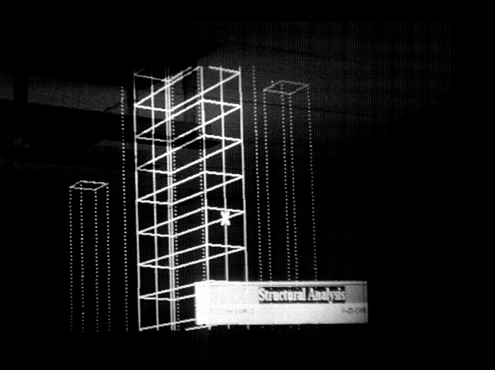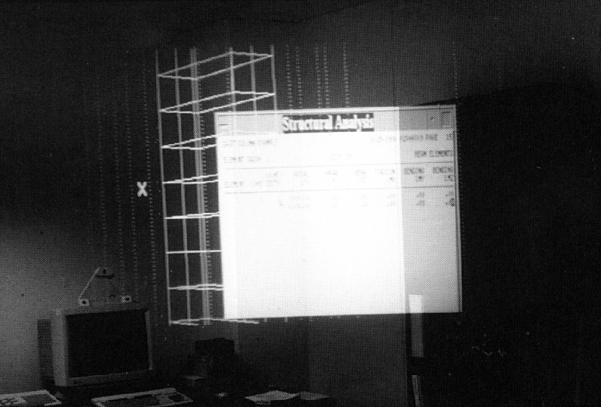 Our prototype allows the user to select a column in order to see it in more detail. We accomplish this by interpreting mouse pointer events on the X11 root window as affecting the 3D objects that project to the cursor position on the head-mounted display. In Figure 4, the user has selected the leftmost column, causing the outlines of the support structures to dim. (Our current display hardware is one-bit deep, so dimming is accomplished through the use of different line styles; in this case, dotted lines.) After a short delay, the reinforcing steel bar (re-bar) internal to the column is revealed, as shown in Figure 5. In addition, a structural analysis of the column is presented to the user. This information is provided by a world-fixed X11 window that allows the user to scroll through a textual analysis of the column produced by Dast, a commercially available structural analysis and design program (Das, 1993).