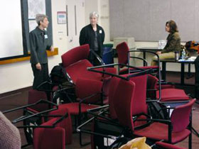 At the Oral History and Performance Conference, we tried to mimic what we did at the ATHE Conference. After we did an abstract eruption of the hurricane and were tossed from our "chairs" in our "homes" we then proceeded to go to audience members comfortably watching sitting in their chairs and politely asked them to give us their chairs and we kept piling their chairs into a big pile into the center of the ballroom of the hotel where we did the work thus causing the audience to be "homeless" (or "chairless" in this case). We also tried to take personal stuff like pocketbooks too I believe and throw them into the pile but those possessions were clung onto by most. We wanted them to connect with what it must feel like to suddenly be at the mercy of such a catastrophic event as Hurricane Katrina. They were then dislodged during the rest of the program where we also aired the seniors interviewed about their experiences talking above them on these huge tv screens (while Char and I moved around with taped recordings of the voices to the now "homeless/chairless" audience standing there). Other cast members were doing other things as well while all this was going on. At the end where we showed the final video oral history video on the screen the whole cast just altogether walked out of the ballroom and left the mess and the audience to deal with the aftermath of standing there "no place to go" and vulnerable. – Harriet Lynn