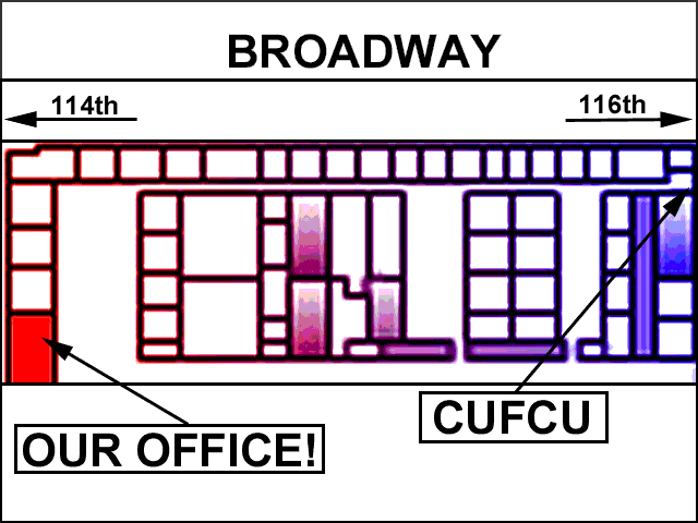 HOW: Take the Broadway side elevator to the 5th floor and walk to the windows that look out over Broadway. On your left is a door which should be open. Just inside the door, on your right, will be the Credit Union (or CUFCU). When the hall opens up, you just be staring at us through the glass doors. Look for sexually explicit artwork and "Re-elect Reagan" banners.