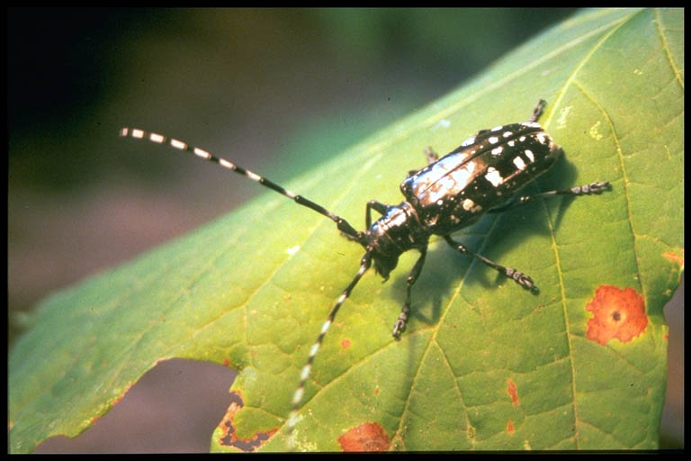Identification:: The Asian Longhorned Beetle (ALB) is large, ranging from 0.75-1.25 inches long; with very long black and white antennae.  The body is glossy black with irregular white spots.  These beetles feed on many species of hardwood trees. Adults can be seen from late spring to fall depending on the climate. Predominant reproductive cycle is one year, passing the winter most commonly in the larval stage. Adult emergence in New York and Illinois appears to range from July to November.  The female ALB chews depressions (oviposition sites) in the bark of trees to lay eggs. A single female beetle can lie from 35 to 90 eggs. Hatching within 10 to 15 days, the worm–like immature larvae tunnel under tree bark and bore into healthy hardwood trees. The beetle larvae feed on living tree tissue during the fall and winter and, after pupating, emerge through exit holes during the spring. After emerging, adult beetles feed on tree exteriors for 2 to 3 days, then mate. Adult beetles remain active only during summer and early fall months before perishing—completing a 1–year life cycle. Since beetle larvae live deep inside trees the majority of the year, they can easily and unknowingly be moved in firewood, live trees, or fallen timber. ALB more commonly spread by natural means; under their own power they can fly distances greater than 400 yards. Migration may also depend on the abundance of suitable host materials (i.e., hardwood trees).