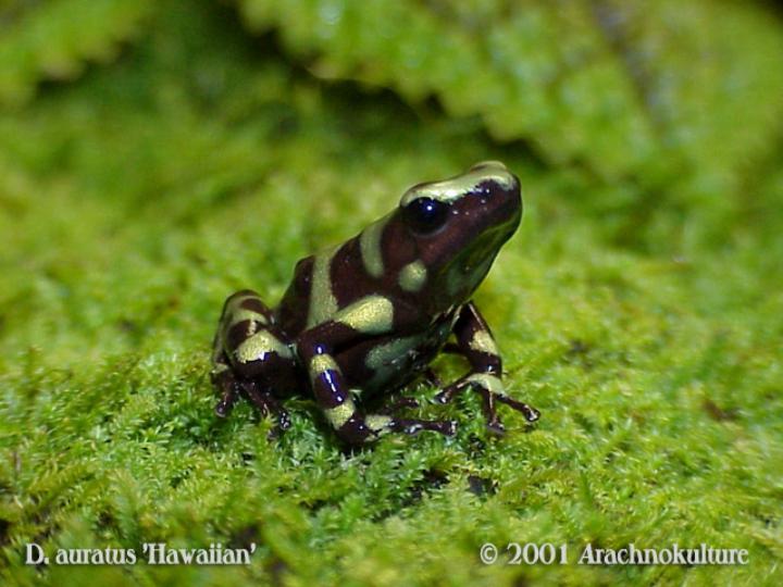 In their native habitats D.auratus engages in mutualistic relationships with the bromeliads in which tadpoles develop. The bromeliads provide a safe place for the tadpoles who feed on insects and detritus, as well as on unfertilized eggs deposited for them by the adult female. The bromeliads benefit from the nutrients that the tadpoles add to this mini-system. Water-retaining plants are present in Hawaii and may be utilized by introduced D. auratus.Benefit(s): The consumption of non-native arthropods is a potential benefit of having this species in Hawaii. Besides the direct effect of reducing populations of undesirable arthropods, D. auratus may also be indirectly reducing the plant damage caused by herbivorous arthropods, as has been shown for experimental Anolis introductions in the Caribbean. A potential economic benefit is bioprospecting for new medicines within the large family of dendrobatid toxic skin compounds. D. auratusproduces a pumiliotoxin that might have applications as a cardiac stimulant following heart attacks in people. A compound produced by another Dendrobatid frog, Epipedobates tricolor has been shown to be effective on the same range of pain as morphine yet wihout that drug's negative side effects.