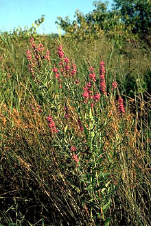 Identification: A perennial herb of moist or marshy sites, 1-2 meters tall, stem square or sometimes six sided, smooth or more often with short upward pointing hairs. As many as 30 to 50 branches emerge from a large root crown that becomes woody with age. Leaves are opposite or borne in whorls of three, sessile (attached directly to the stem), lanceolate to nearly linear 3-10 cm. Purple-magenta flowers are showy, 7-12 mm, 5-7 petals, on a terminal spike 10 to 40 cm tall, appearing from July through September. Styles and stamens are trimorphic. Stamens number mostly 12, alternating shorter and longer. Sepals, green outer floral leaves, are fused, forming a tube around ovary. 2n= 30, 50, 60. Mature plants can produce more than 2 million 1 mm long, reddish-brown seeds per year.A closely related exotic, though not invasive, species, L. virgatum, is established locally in MA and new England as a local escape from cultivation, and is distinguished from L. salicaria by its smooth stalk and leaves that narrow towards the base.