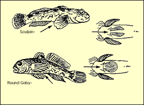 Benefit(s): The only benefit attributed to the round goby is that it is a voracious consumer of another significant Great Lakes invader, the zebra mussel (Dreissena polymorpha). In one laboratory study (Ghedotti, et al,1995), round gobies of average (80 - 110 mm) length were able to consume zebra mussels 100 - 120mm in size and ate an average of 36 zebra mussels per day. Gobies also seemed to show a significant preference for zebra mussels over native clams and snails when presented with varying distributions of clumped and unclumped prey over different substrates. However, because gobies do not have a swim bladder and are negatively buoyant, prey attached to an aquarium wall just 20cm off the bottom appeared safe from round gobies.