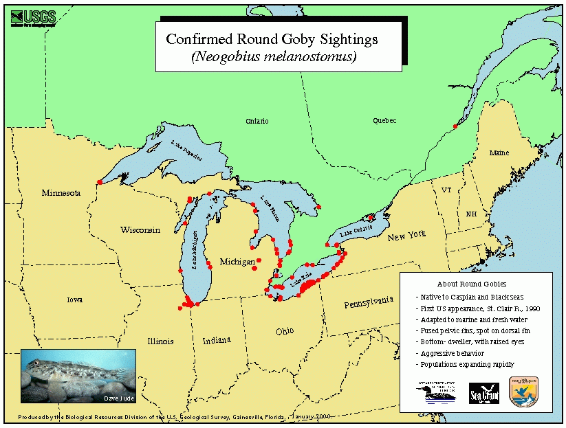 Site and Date of Introduction: The earliest confirmed sighting of a round goby in the Great Lakes drainage occurred on June 28, 1990 when one was taken by a U.S. angler on the St. Clair River in Canadian waters off Sarnia, Ontario. During the winter of 1990-1991, 9 of 11 round gobies found near the Belle River Power Plant in Michigan were identified as young-of-the-year, indicating that spawning had occurred some time in the previous season.