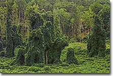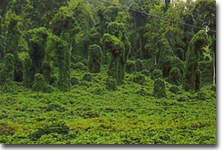 Reason(s) Why it has Become Established: Besides escaping native insect predators, the climate of the Southeastern US is perfect for kudzu. The vines grow as much as one foot per day during summer months, climbing anything from trees to power poles to abandoned buses. In addition, kudzu is an extremely hardy plant. It is drought tolerant and frost only harms its above ground portions. The thick storage roots, which form from stem nodes touching the ground, can grow as deep as one meter. They also have a high starch content that allows the plant to grow early in spring and regrow if the vines are damaged in the summer. Flowering in late summer and early fall, kudzu produces a large amounts of seeds which are dispersed by birds and mammals.