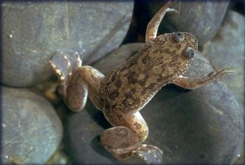 Phylum or Division: ChordataIdentification: The genus Xenopus is the only frog with clawed toes. Within this genus, laevis is the only species that exceeds 100 mm in length, with femals adults reaching 110-130 mm and male adults generally 10-30% smaller. Other than size, morphological differences among Xenopus species are rather indistinct. The African clawed frog has a flat body with a relatively small head. Its skin is smooth, with dorsal surfaces usually colored in mottled hues of olive-brown or gray with darker marks and ventral surfaces a creamy white color. This frog has no tongue, no teeth, no eyelids, and no external eardrums. Its forelimbs have four unwebbed fingers and its hind limbs have five long, webbed toes with dark claws on the three outer toes.