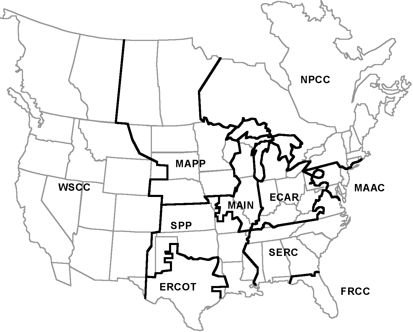 Fig. 2. Geography and Regional Reliability Councils for the North America power system (courtesy of B. Buehring, Argonne National Laboratory)