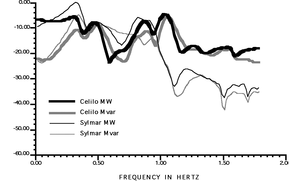 The more important interarea modes of the western power system are visible in Fig. 4. The data there show response of the Pacific AC Intertie to real and reactive power injections at the Celilo and the Sylmar terminals of the Pacific HVDC Intertie. These results were generated with a simulation model that had been calibrated against system disturbances of the early 1990s, and seem realistic.