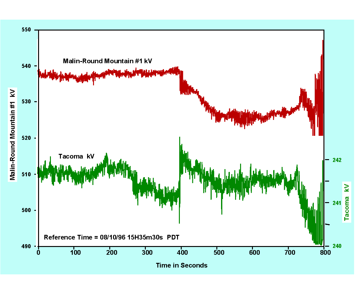 At 02:24 p.m. local time, arcing to a tree tripped a 345 kV line from the Jim Bridger plant (in SW Wyoming) into SE Idaho. Relay error also tripped a parallel 345 kV line, initiating trip of two 500 MW generators by stability controls. Inadequate reserves of reactive power produced sustained voltage depression in southern Idaho, accompanied by oscillations throughout the Pacific Northwest and northern California. About 24 seconds after the fault, the outage cascaded through tripping of small generators near Boise plus tripping of the 230 kV "Amps line" from western Montana to SE Idaho. Then voltage collapsed rapidly in southern Idaho and helped by false trips of 3 units at McNary at the north end of the PACI. Within a few seconds the western power system was fragmented into five islands, with most of southern Idaho blacked out.