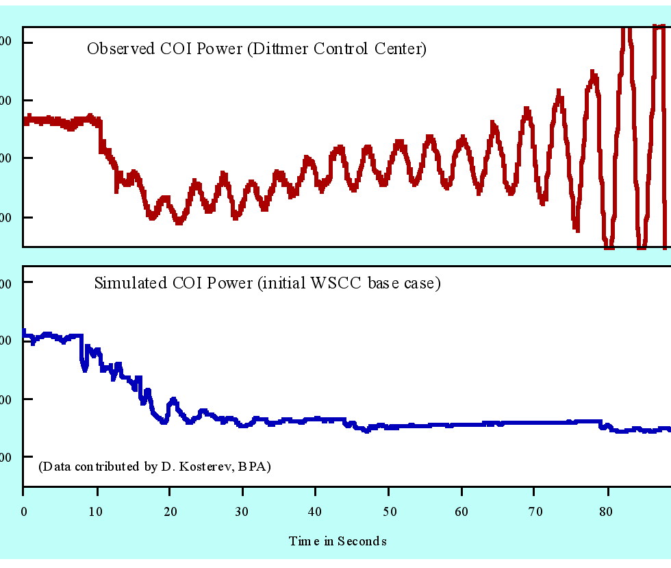Fig. 9 demonstrates that, prior to the August 10 breakup, standard WSCC planning models could be very unreliable predictors of oscillatory behavior. This is a difficult problem of long standing, and the utilities there had expended considerable effort in attempts to reduce it [,,]. Its potential for leading planners to poor decisions is readily apparent.