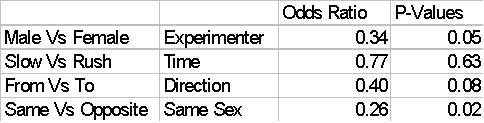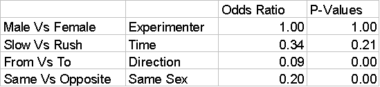 As is evident from the data tables (above) we see that the time of day variable is not significant for question one however, it is significant for question two such that; people in a rush are less likely walk the stranger to the location in question. Interestingly, being in a rush did not deter the subjects from helping when the task was easy. Direction was significant for both question one and question two such that; people walking away from the bookstore were less likely to help than those walking toward the bookstore.