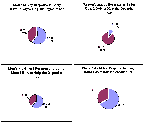 Problems with our survey included wording of questions. Some people were confused with the scale that we used. We marked number one likely and number nine as unlikely. Some people were confused with this numbering system. Also, Many people (more men than women) inquired about the physical attributes of the person in need. Perhaps our questions were not as detailed as they could have been. Another important problem with our survey was response bias. We attempted to reduce this effect by including distracter question, as well as refusing to inform the subjects of what the survey was attempting to uncover until after they had filled it out; the respondents may have lied so they could appear more helpful than they would be in reality. Another problem with our survey was nonresponse bias. Although every person was randomly selected every three minutes, in varied locations, several people refused to take our survey. This introduces bias into our survey. Perhaps people who agree to take a survey are in general more willing to help than those who refuse to take surveys.