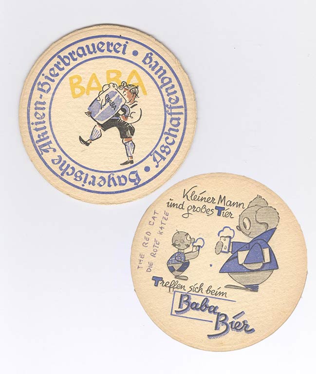 BABA Bier - Bayerische Aktien Bierbrauerei Aschaffenburg. Kleiner Mann und großes Tier / Treffen sich beim / Baba Bier. Does anybody remember what Die Rote Katze is? I don't!