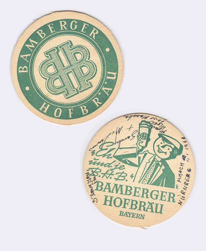 “Eh und je B.H.B.” Bamberger Hofbräu Bayern This was from a Frankfurt High School bus trip to Nürnberg to see a football game, March 11, 1961.