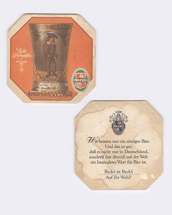 Beck's. Edle Trinkgefäße Ranftbecher Wien 1817. Wir brauen nur en einziges Bier / Und das so gut, daß es nicht nur in Deutschland, / sondern fast überall auf der Welt ein besonderes Wort für Bier ist. / Beck's ist Beck's / Auf Ihr Wohl!