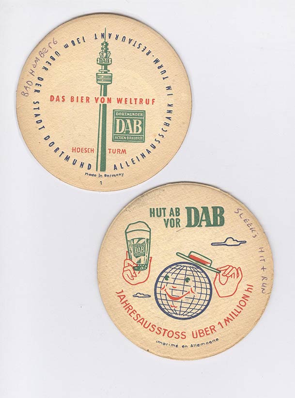DAB - Dortmunder Actien Brauerei, das Bier von Weltruf. “Hut ab vor DAB” (Hats Off for DAB). Picture of Hoesch Turm in Dortmund.