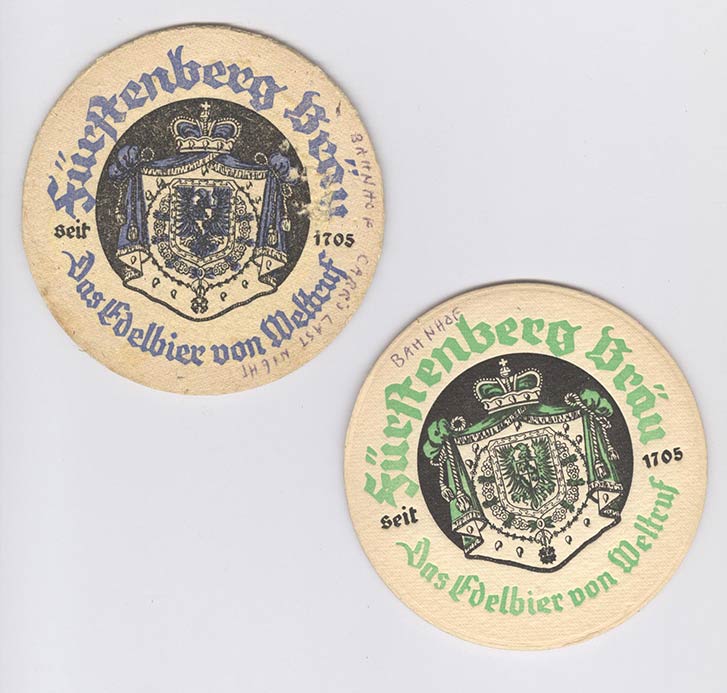Fürstenberg Bräu - Das Edelbier von Weltruf seit 1705. This is from somebody's going-home party in one of those little stand-up snack places in the Hauptbahnhof in 1960 or 61.