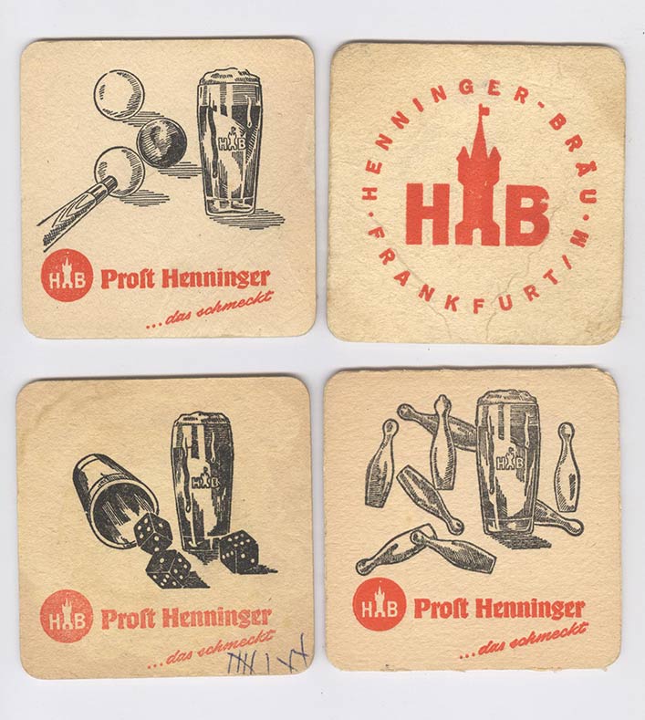 Prost Henninger ...das schmeckt. Henninger Bräu Frankfurt / M. with game themes on the back. This was the other ubiquitous logo in Frankfurt, H and B with the Eschenheimer Turm in the middle.