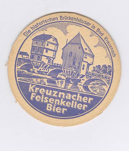 Kreuznacher Felsenkeller Bier from Bad Kreuznach, with picture of Die historischen Brückenhäuser.