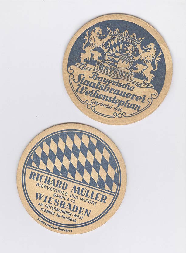 Bayerische Staatsbrauerei Weihenstephan, gegründet 1040. That's not a tax form, that's a year: Founded in the year 1040. That's what can happen if you make something real rather than (say) “complex financial instruments”. The company is still in business. The back of the coaster shows the Bavarian flag motif and the name of the "importer" who supplied this brand to the Frankfurt area (within Germany, Bavaria is like a country, kind of like how Texas is in the USA).
