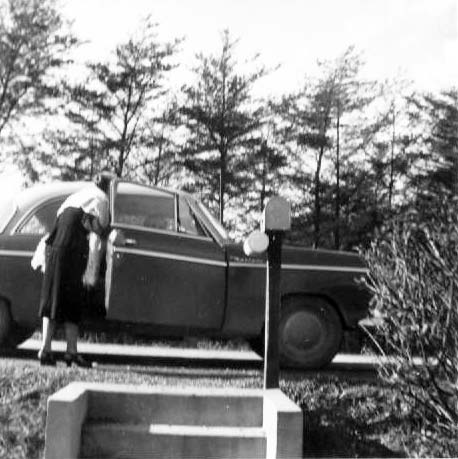 My Mom getting into the car of our next-door neighbor, Mona Joseph. I don't have a picture of Nick or Mona Joseph (except the little blob you can see through the window); this will have to do. February 1956.