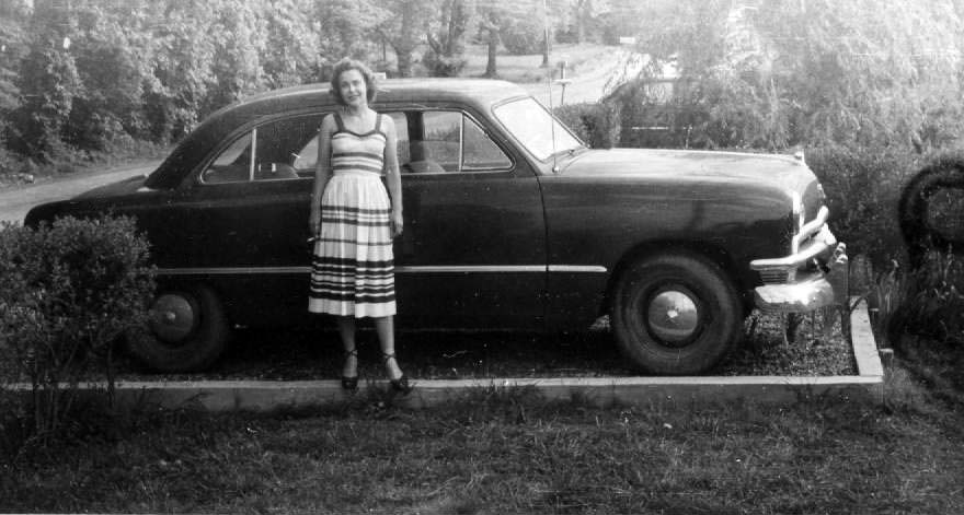 My Mom standing by the family car, a 1950 Ford, on Kirby Road, early-to-mid 1950s.