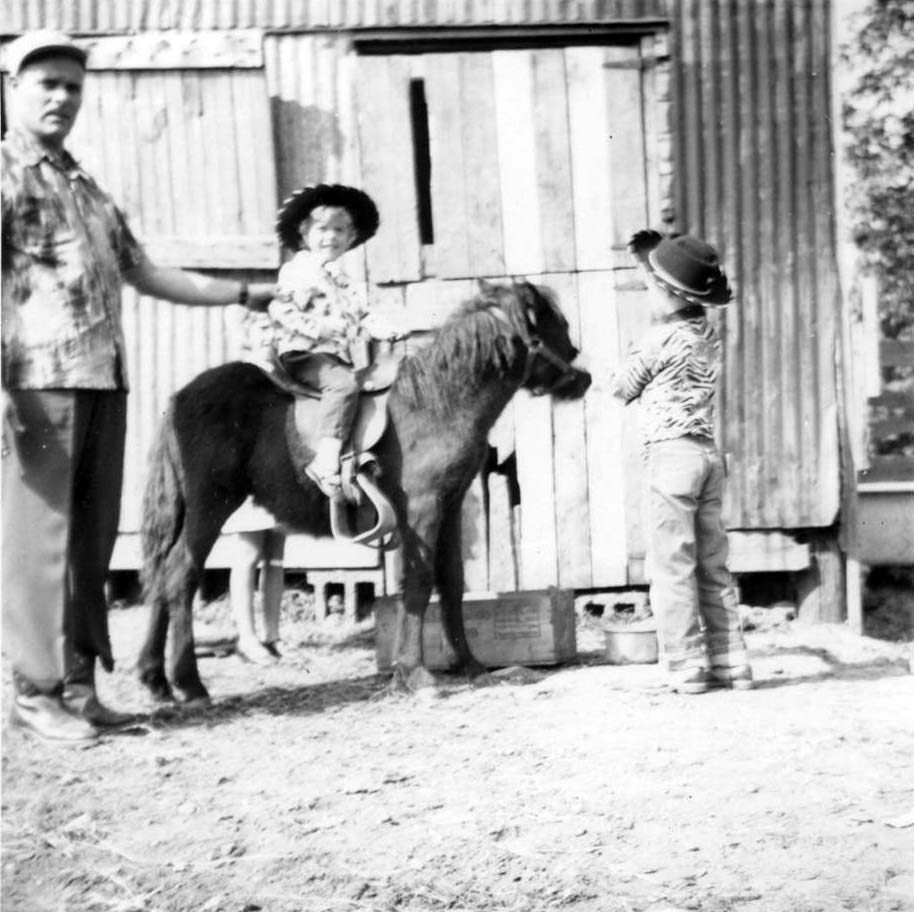 Nolan C. Walker, Linda White on a very young Peanuts, and Jimmie Walker, early 1950s, in the Walkers' back yard.