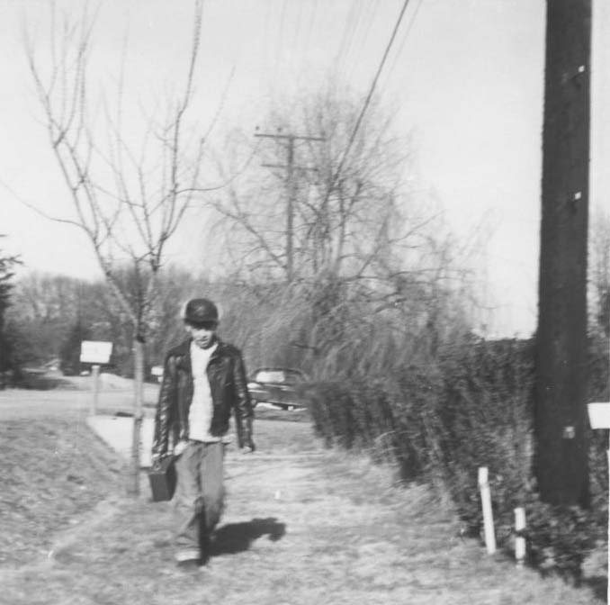 Harry Hill with lunchbox, coming home from school.