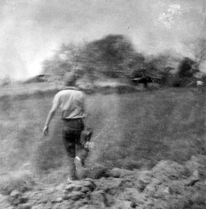 Harry Hill cutting loose in the field behind the farmhouse.